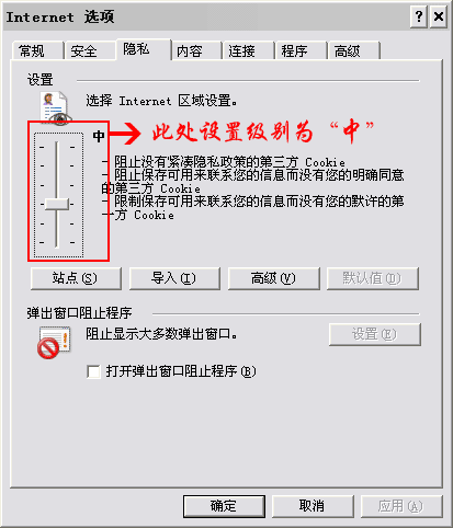 在打开的《Internet选项》窗口中,点击《隐私》,如下图所示操作后,点击《确定》按钮就可以了。(常用浏览器均支持,建议使用IE6以上版本)。