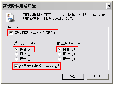 ②在弹出的窗口中,打勾《替代自动cookie处理》、选择《第一方Cookie接受》、选择《第三方Cookie接受》、打勾《总是允许会话cookie》,做如下图所示的操作后,点击《确定》按钮即可。
